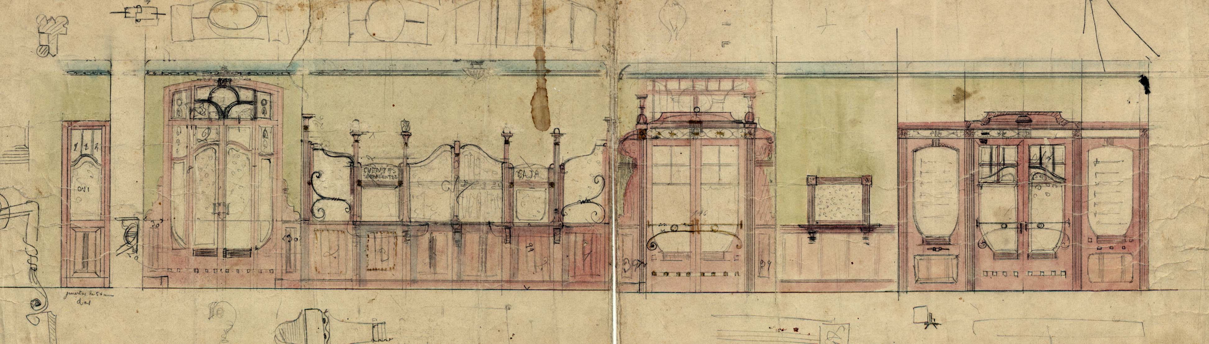 Projecte del taulell i les portes de la sucursal de la banca Saderra, Prat y Compañía, situada al número 27 del carrer de Sant Esteve, a Olot, obra de Sadurní Brunet.