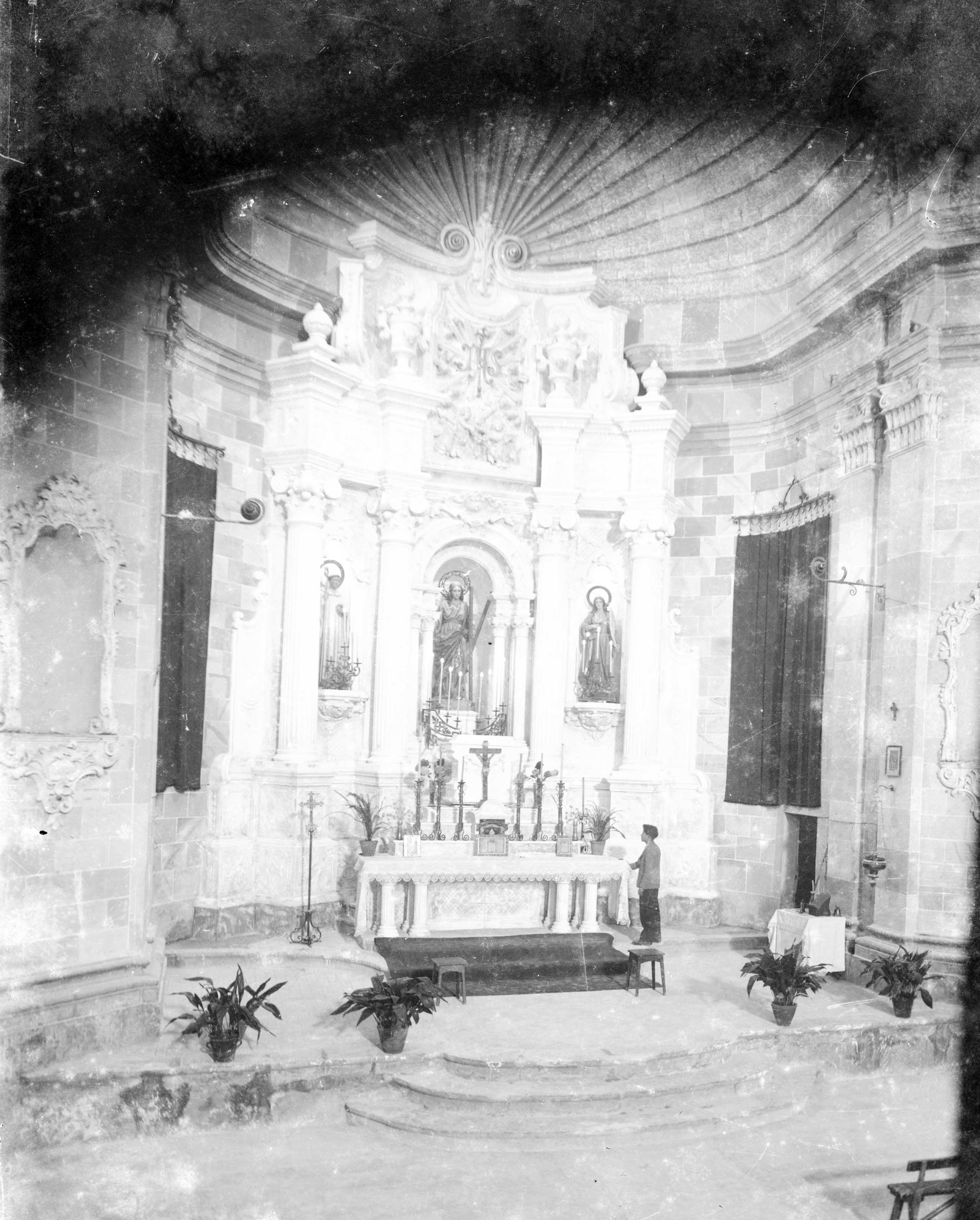 Altar major de l’església de Santa Eulàlia de Noves, a Garriguella, amb Jordi Brunet Forasté al davant, 1941 (ACGAX. Fons Sadurní Brunet Pi. Autor: Sadurní Brunet)