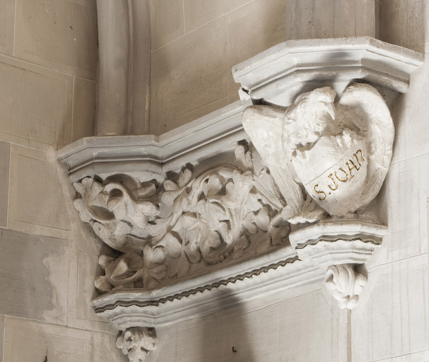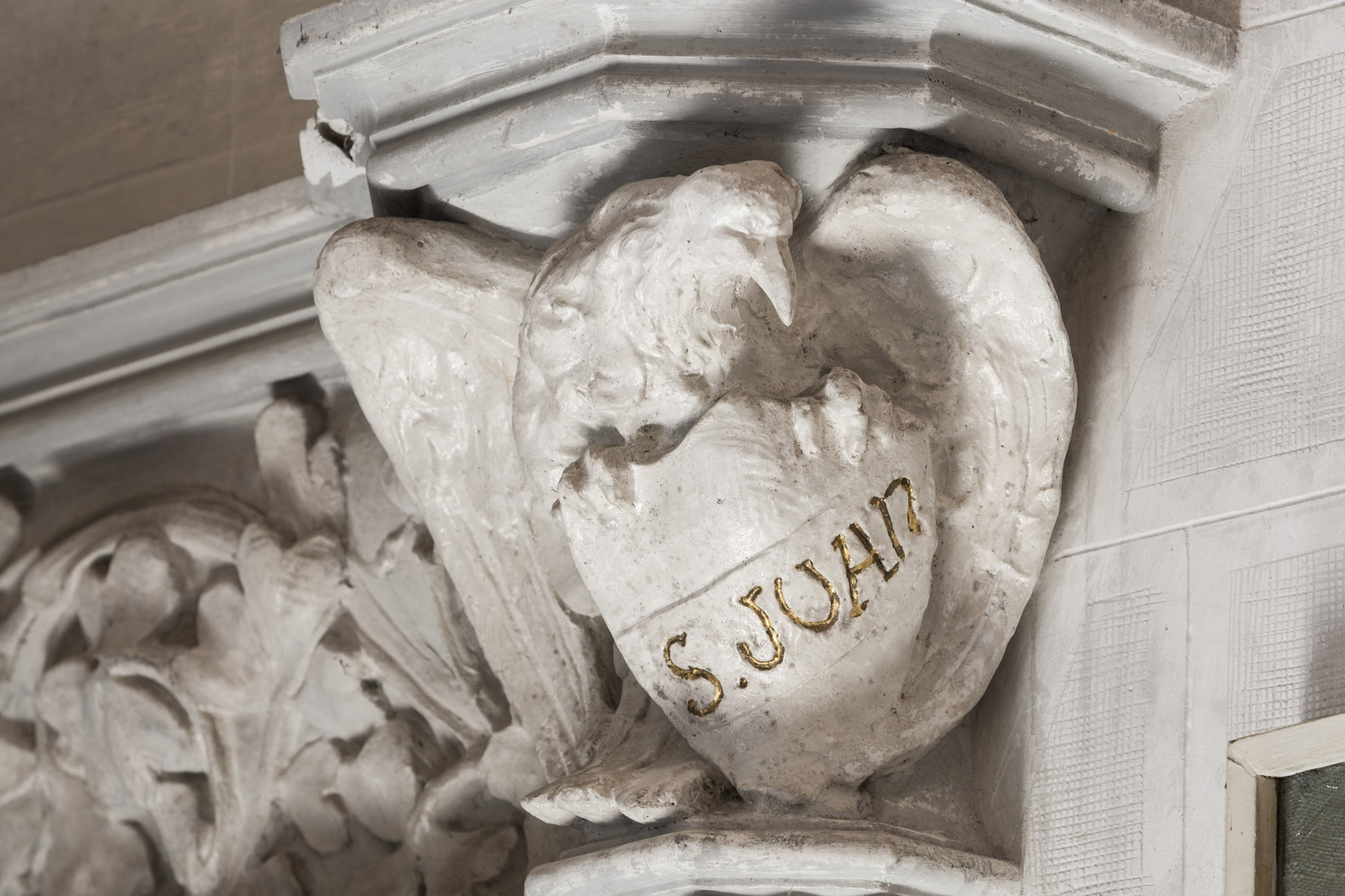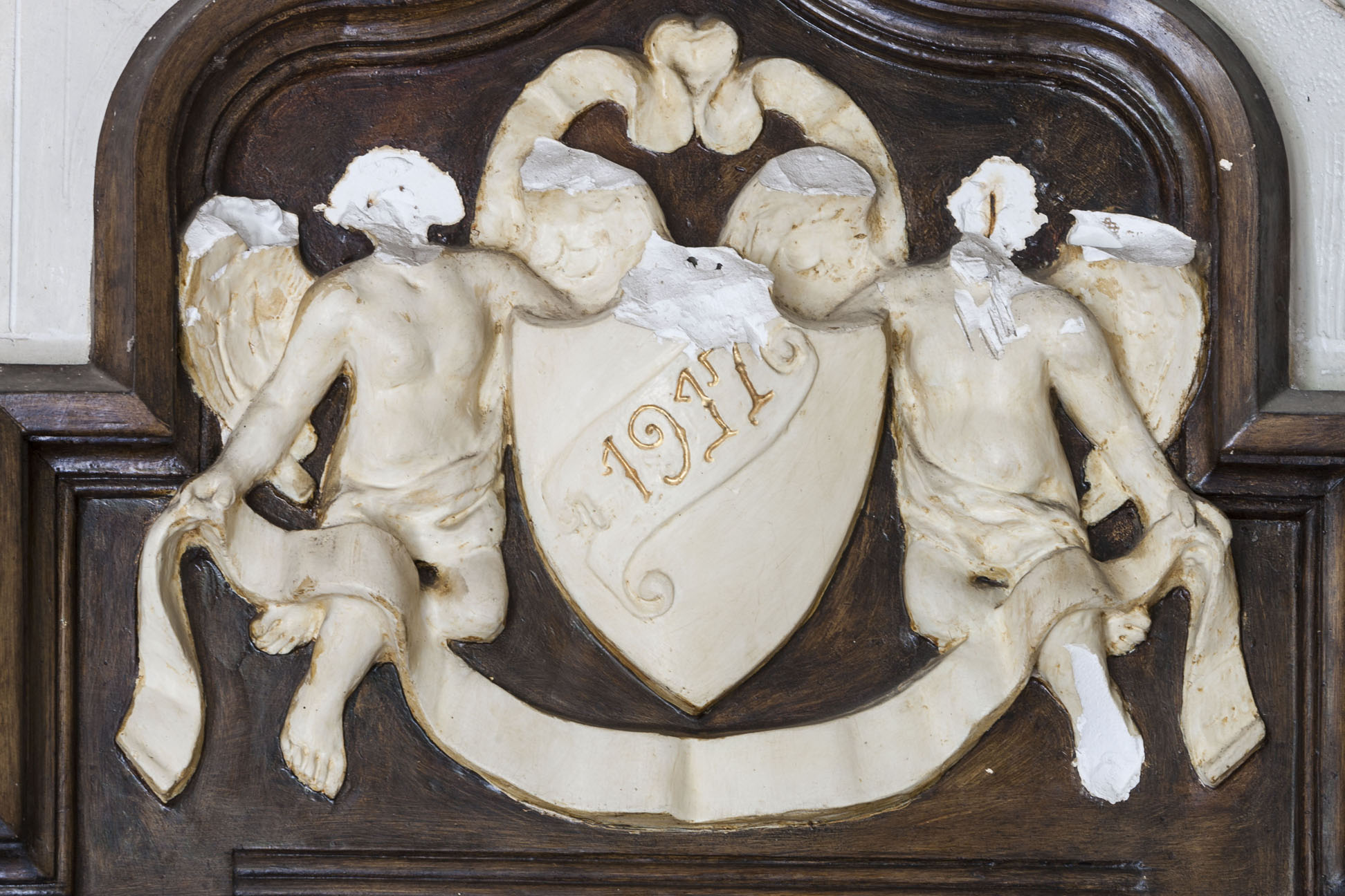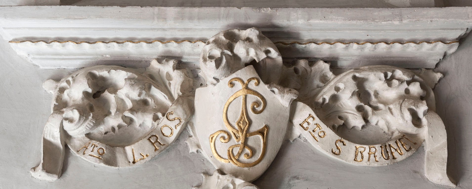 A banda i banda de l’altar —per equilibrar simètricament la composició—, Brunet va replicar l’única porta d’accés des de l’interior de la casa, repetint la mateixa forma i simulant la fusta amb guix pintat. Damunt de cada entrada (la real i la cega) dues parelles d’angelets —ara decapitats— sustenten sengles escuts amb l’any d’acabament de l’obra: 1917. La fúria iconoclasta es va centrar en totes les figures religioses, però va deixar passar els símbols dels quatre evangelistes situats en els capitells de les cantonades, des d’on arrenquen les nervadures neogòtiques del sostre. A la base de la finestra de la paret lateral hi ha una mena d’escut o emblema amb els noms de Sadurní Brunet i l’arquitecte Lluís Ros. Un detall ben particular és el terra amb petites tessel·les de mosaic que recreen motius florals i un escut de Catalunya. En conjunt, una barreja de referències neomedievals i detalls més propers al Modernisme que devia anar resolent i ajustant a les voluntats de totes les parts implicades.