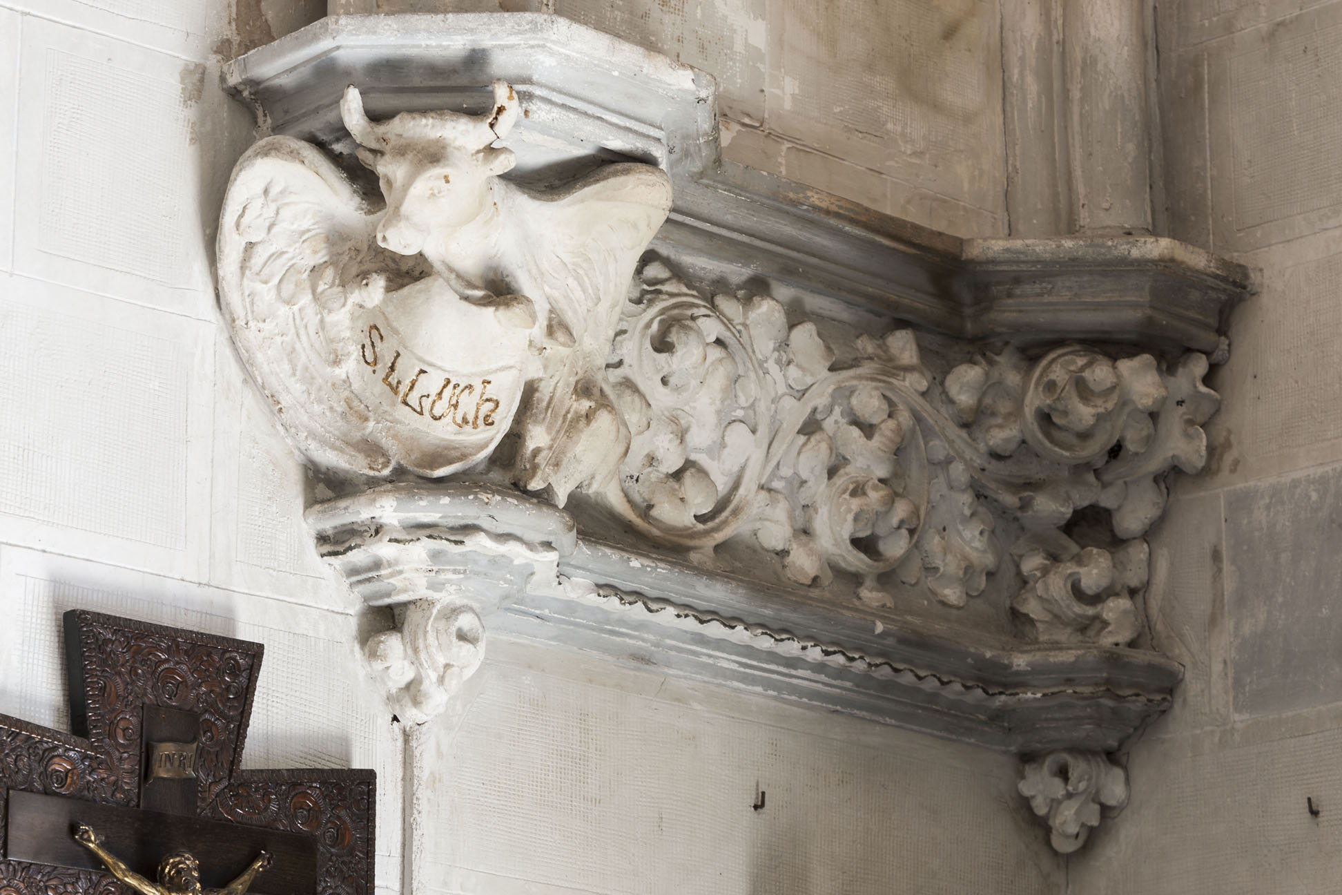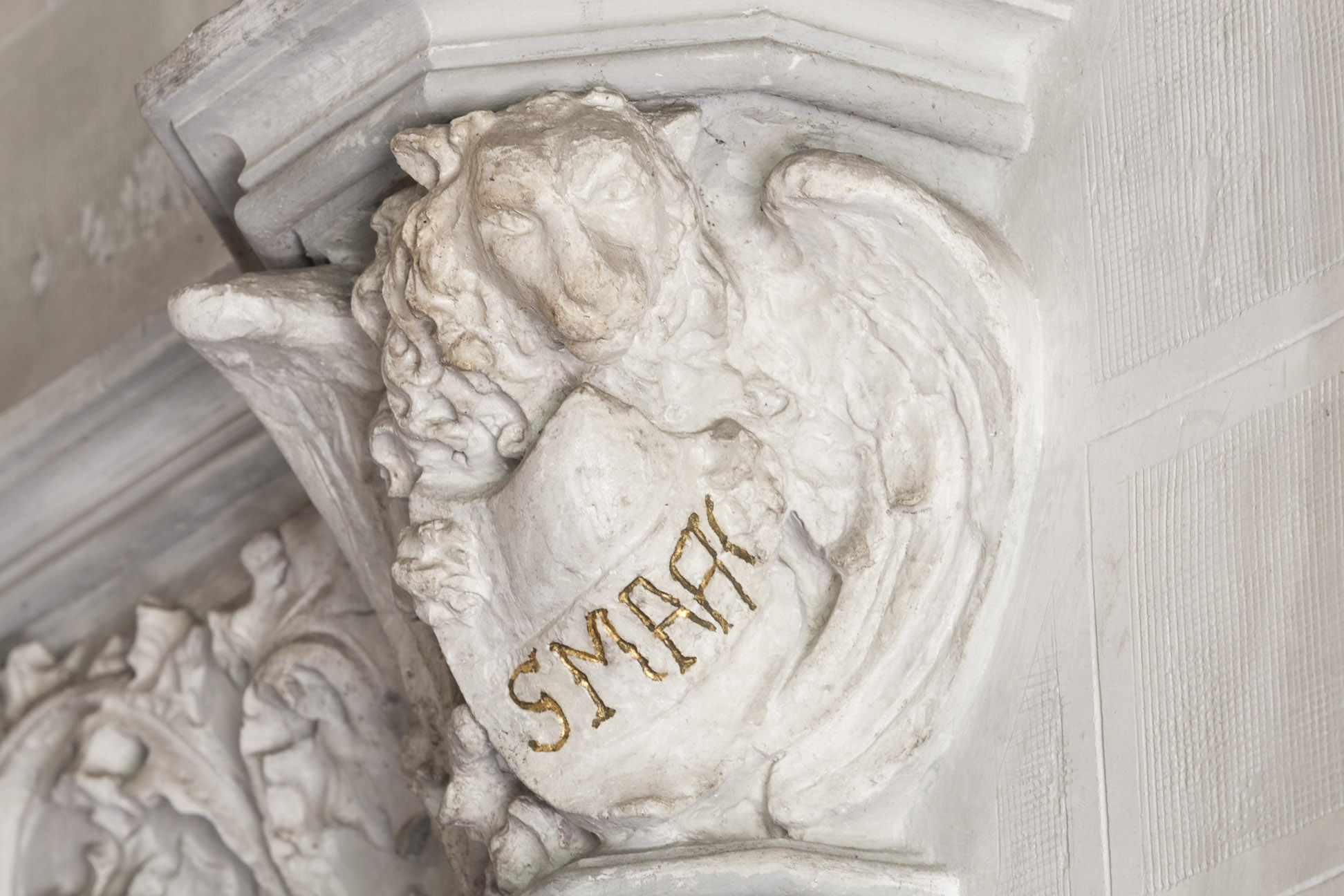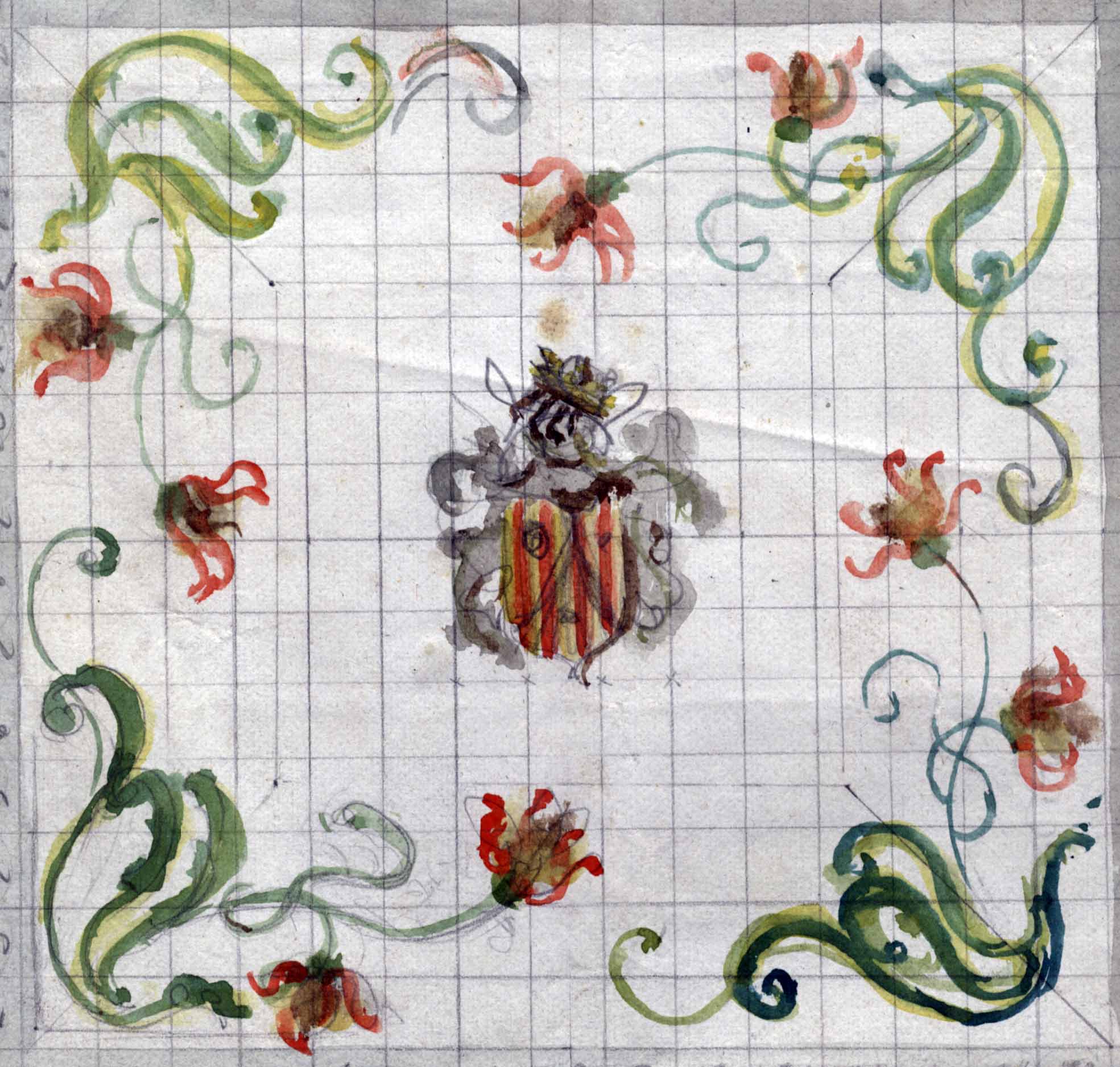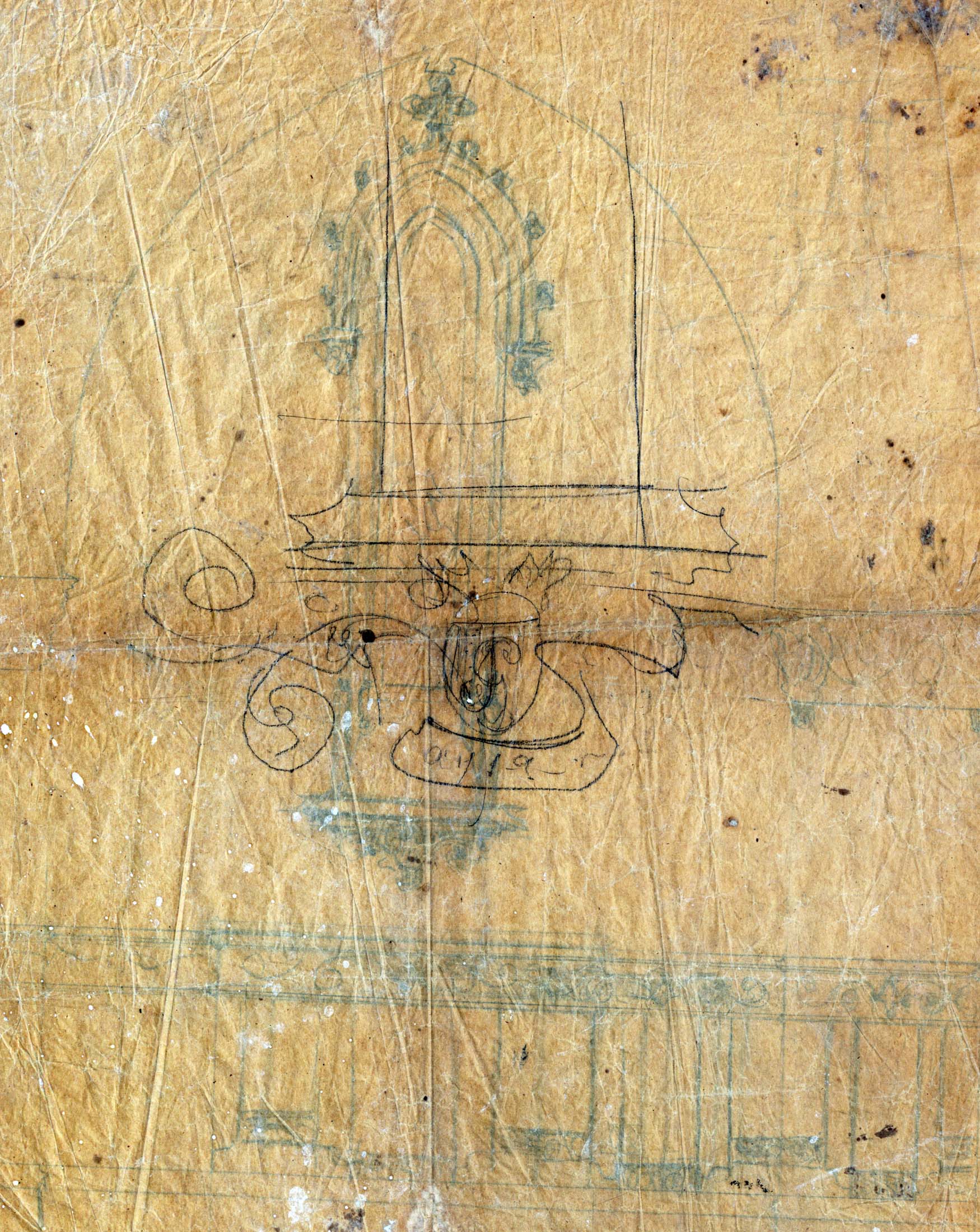 A banda i banda de l’altar —per equilibrar simètricament la composició—, Brunet va replicar l’única porta d’accés des de l’interior de la casa, repetint la mateixa forma i simulant la fusta amb guix pintat. Damunt de cada entrada (la real i la cega) dues parelles d’angelets —ara decapitats— sustenten sengles escuts amb l’any d’acabament de l’obra: 1917. La fúria iconoclasta es va centrar en totes les figures religioses, però va deixar passar els símbols dels quatre evangelistes situats en els capitells de les cantonades, des d’on arrenquen les nervadures neogòtiques del sostre. A la base de la finestra de la paret lateral hi ha una mena d’escut o emblema amb els noms de Sadurní Brunet i l’arquitecte Lluís Ros. Un detall ben particular és el terra amb petites tessel·les de mosaic que recreen motius florals i un escut de Catalunya. En conjunt, una barreja de referències neomedievals i detalls més propers al Modernisme que devia anar resolent i ajustant a les voluntats de totes les parts implicades.