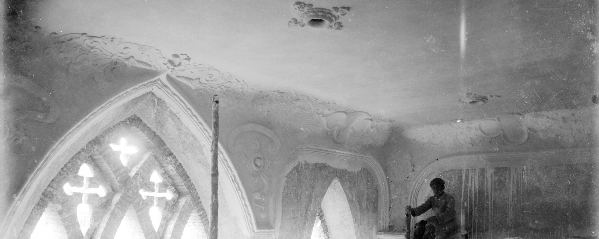 L’any 1922 s’iniciaven els tràmits per construir una església al costat mateix de la casa convent on s’havien instal·lat les religioses clarisses a finals del segle XIX. El projecte, signat per l’arquitecte Josep Danés i Torras, constava d’una sola nau amb elements neogòtics que s’alineava perpendicularment al carrer de Tomàs de Lorenzana, d’Olot. En la redacció d’una notícia sobre la inauguració, publicada l’1 de gener de 1925 a La Tradició Catalana, es descriu que «tant en l’ornat de guix i les imitacions de pedra dels sòcols de les columnes, obra de l’intel·ligent industrial Sadurní Brunet, com en els finestrals, cor i demés decorats dels tres altars dedicats a Sant Antoni de Pàdua, el Sagrat Cor de Jesús i la Beata Teresa del nen Jesús hi ha presidit una bona execució i gust exquisit, fent de l’església de la Providència una de les més escaients i devotes de la ciutat». Gràcies a aquest breu podem saber l’obra que hi va executar Brunet, ja que no se’n conserven dibuixos preparatoris, només quatre fotografies que va fer: una perspectiva general des del terrat d’un edifici proper i tres de l’interior amb bastides en què es pot intuir la decoració. El tipus d’ornamentació detallada, sinuosa i floral, s’aproxima més als seus acurats dissenys d’interiors d’habitatges que no pas als formats convencionals que duria a terme en edificis religiosos després de la Guerra Civil. En aquest sentit, podem entendre la sorpresa i el bon gust apuntats en la crònica esmentada. Un any més tard es completaria el conjunt iconogràfic amb l’altar major, fet per l’artista Melcior Domenge.