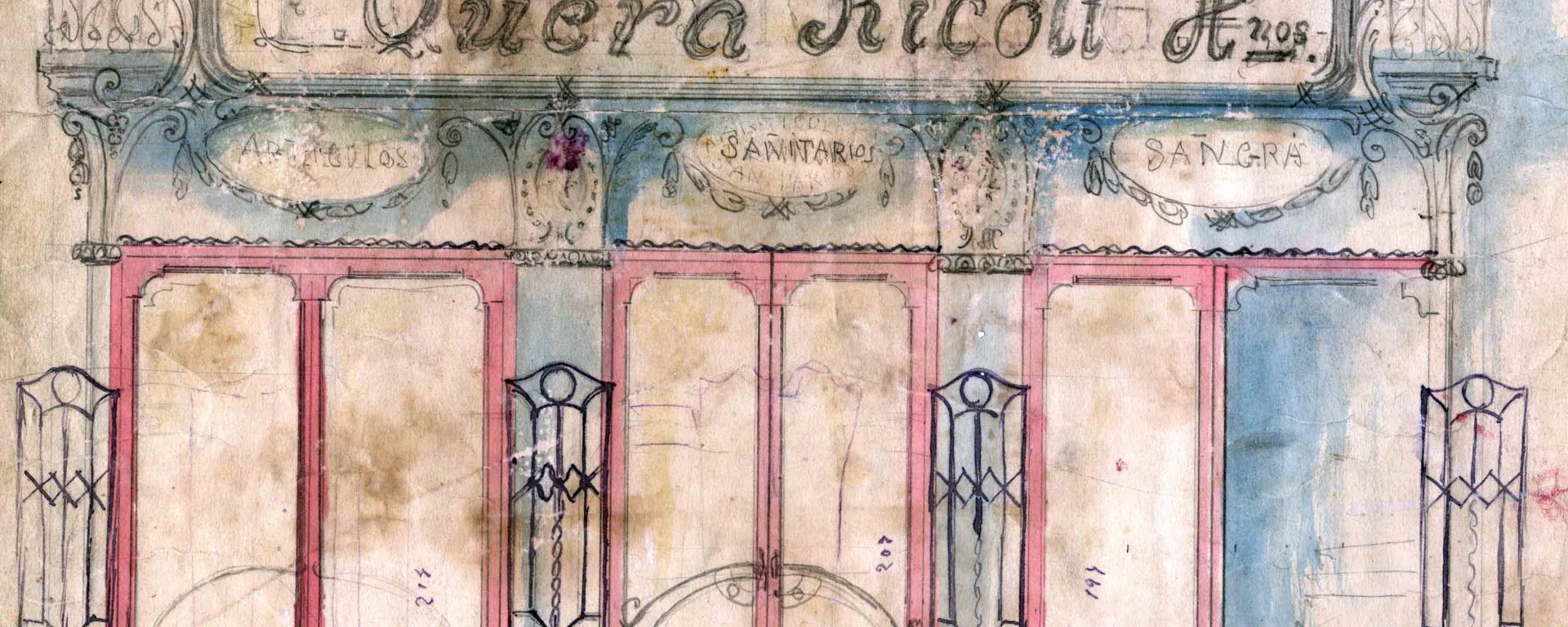 Malauradament, no es conserva cap fotografia ni plànol complet que ens permeti dimensionar tota la tasca que hi va dur a terme; només podem fer-nos-en una idea a partir de l’únic document que es conserva en el fons: un dibuix acolorit de la façana que mostra, sense excessiu detall, els treballs de forja i d’ebenisteria, la decoració del fris superior i el rètol de l’establiment, amb una tipografia molt similar a la que Sadurní Brunet empraria en els esbossos de l’Hotel del Parc o la ferreteria Agustí. Gràcies a l’esborrany de la factura conservat en el dietari podem saber que es va fer càrrec de la direcció de tota l’obra i que a l’interior hi va dur a terme un abundant treball decoratiu.