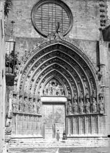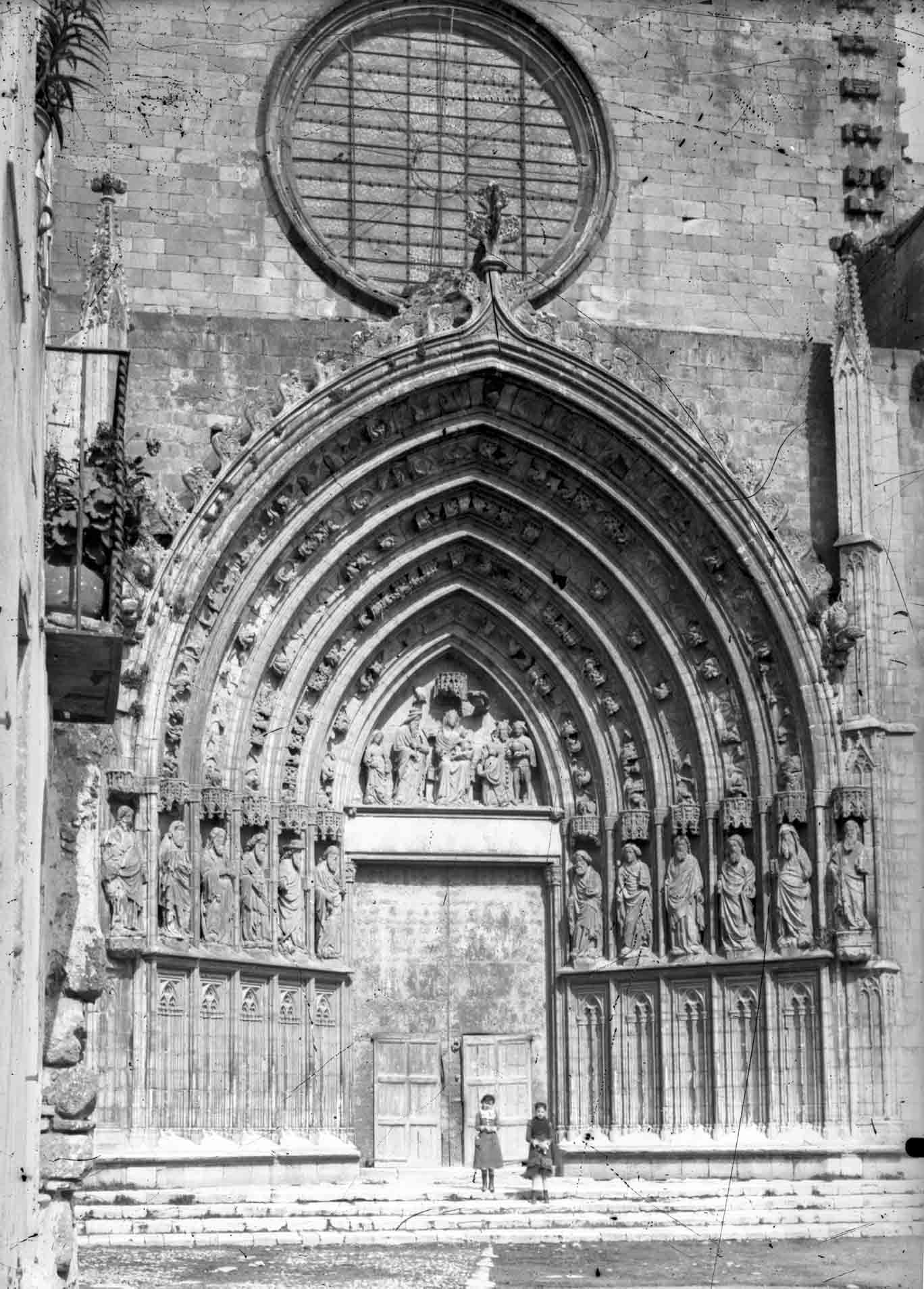 Vista frontal de la façana de la basílica de Santa Maria, a Castelló d’Empúries, 1942 (ACGAX. Fons Sadurní Brunet Pi. Autor: Sadurní Brunet)