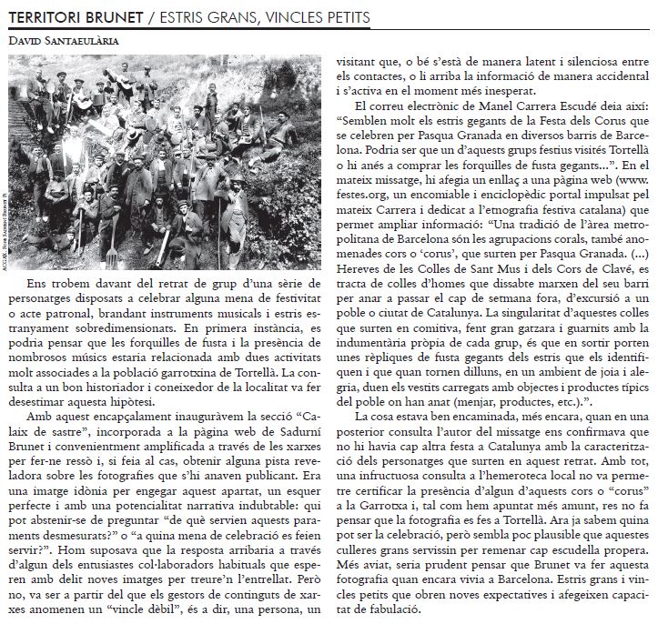 La cosa estava ben encaminada, més encara, quan en una posterior consulta l’autor del missatge ens confirmava que no hi havia cap altra festa a Catalunya amb la caracterització dels personatges que surten en aquest retrat. Amb tot, una infructuosa consulta a l’hemeroteca local no va permetre certificar la presència d’algun d’aquests cors o “corus” a la Garrotxa i, tal com hem apuntat més amunt, res fa pensar que la fotografia es fes a Tortellà. Ara ja sabem quina pot ser la celebració, però sembla poc plausible que aquestes culleres grans servissin per remenar cap escudella propera. Més aviat, seria prudent pensar que Brunet va fer aquesta fotografia quan encara vivia a Barcelona. Estris grans i vincles petits que obren noves expectatives i afegeixen capacitat de fabulació.