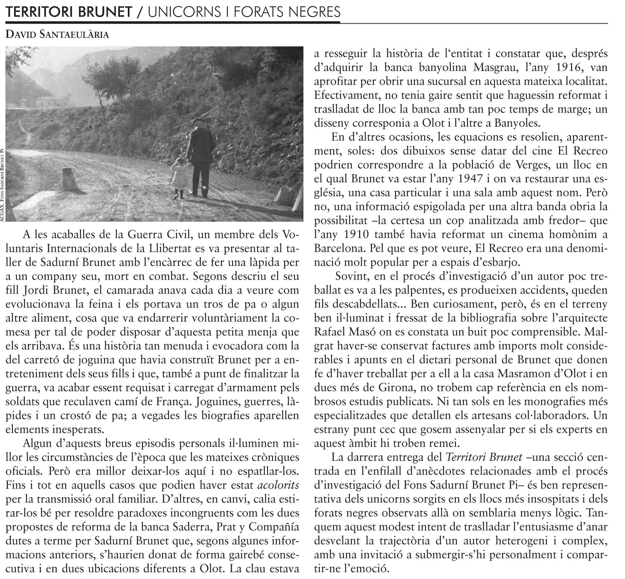 La darrera entrega del Territori Brunet –una secció centrada en l’enfilall d’anècdotes relacionades amb el procés d’investigació del Fons Sadurní Brunet Pi– és ben representativa dels unicorns sorgits en els llocs més insospitats i dels forats negres observats allà on semblaria menys lògic. Tanquem aquest modest intent de traslladar l’entusiasme d’anar desvelant la trajectòria d’un autor heterogeni i complex, amb una invitació a submergir-s’hi personalment i compartir-ne l’emoció.