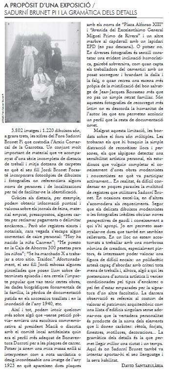 Excitació, vertigen i responsabilitat és el que sentia en el moment d’acceptar l’encàrrec d’estudiar l’extens (i gairebé inèdit) fons personal de Sadurní Brunet Pi i traduir-lo en dues exposicions: l’una, sobre el vessant fotogràfic, a la Sala d’Actes de l’Arxiu Comarcal de la Garrotxa, i, l’altra, sobre tota la trajectòria, a la Sala Oberta del Museu de la Garrotxa. Dues mostres que van acabar essent tres (l’apartat de fotografia es va desdoblar) a les quals es va afegir l’espai web, una eina flexible, ideal per completar continguts, oferir-los a un públic més ampli i dotar l’autor investigat d’allò que s’anomena “empremta digital”. Tot molt ben intencionat, amb un afegitó conegut i inevitable: els marges estipulats i finits d’una exposició ara ja no tenien aturador en l’àmbit virtual, perquè sempre hi ha l’opció de millorar o de fer créixer el conjunt. Gairebé un parany per a qui s’obstina a completar fils descabdellats. M’hi reconec.